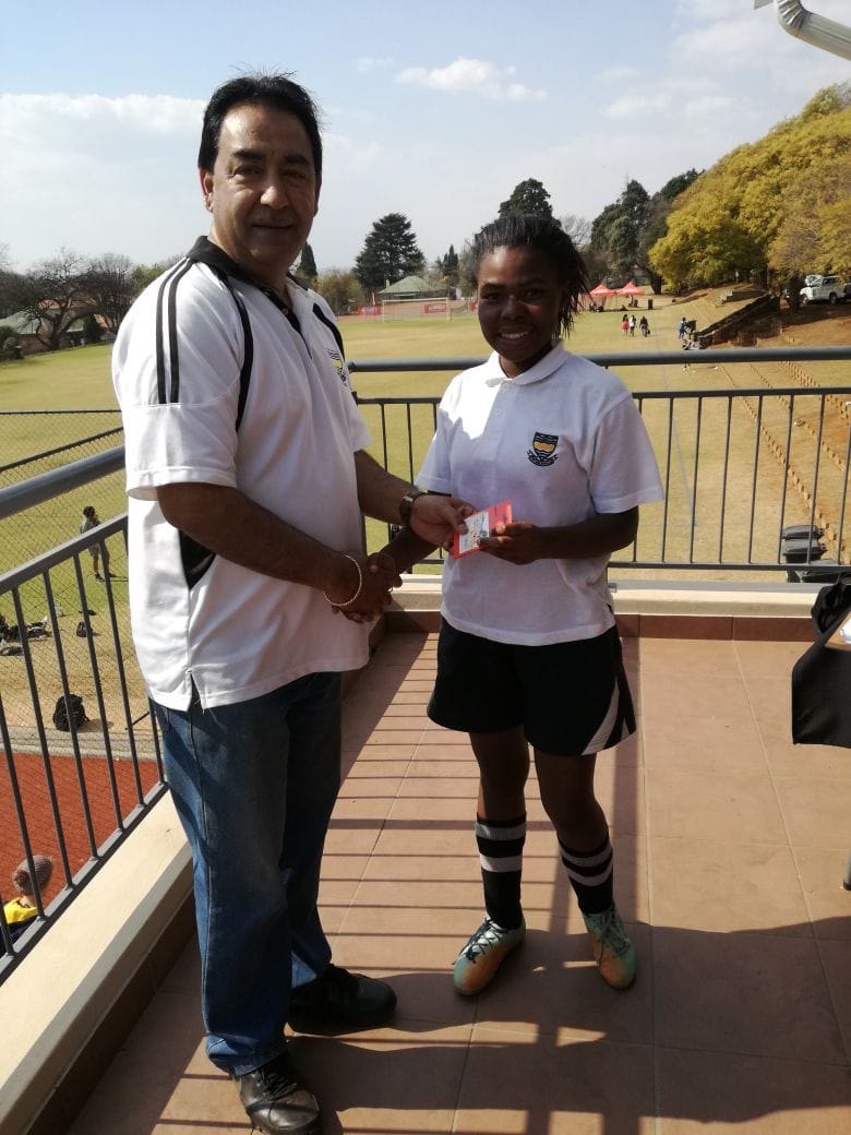 Parktown Girls, Pretoria Girls and Waterstone College participated with Jeppe Girls in their inaugural festival of football on Saturday 5 August. Matches began at 08:30 and went through until 13:15 with each of the schools fielding a junior and a senior team. Each team played two full-field matches and two “5-a-side” matches on Jeppe’s astro court. Mr Brijnath is seen here congratulating Megan Reveley who scored a hat trick against Pretoria Girls and Lerato Tsoai who was awarded goal of the festival.